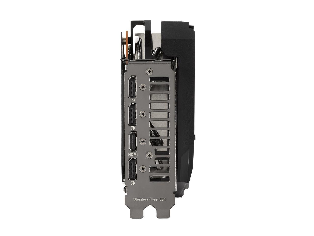 The underside of the card reveals further improvements. Most of the rear is swathed in a protective metal backplate that prominently features a wide vent. The vent allows hot air to escape towards chassis exhaust fans instead of being recycled back into the GPU cooler. A GPU bracket provides extra stability to the critical connection between die and heat spreader. Stainless steel is used for the I/O bracket to protect ports and provide a more secure mount. And a conveniently placed Dual Bios switch allows customization of the card’s default performance profile without software.